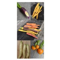 • Dieses Samenset enthält 4 bunte Karottensorten (Daucus carota): Violette Möhre 'Schwarze Spanische', frühe Karotte 'Pariser Markt', gelbe Möhre 'Jaune Du Doubs' und weisse Möhre 'Blanche a Collet Vert'.