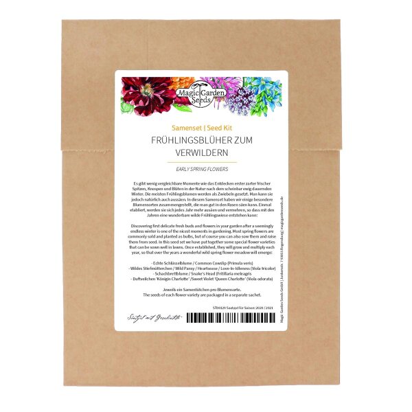 • Dieses Samenset enthält folgende Frühlingsblumen: Echte Schlüsselblume (Primula veris), Wildes Stiefmütterchen (Viola tricolor), Schachbrettblume / Kiebitzei (Fritillaria meleagris), Duftveilchen 'Königin Charlotte' (Viola odorata)